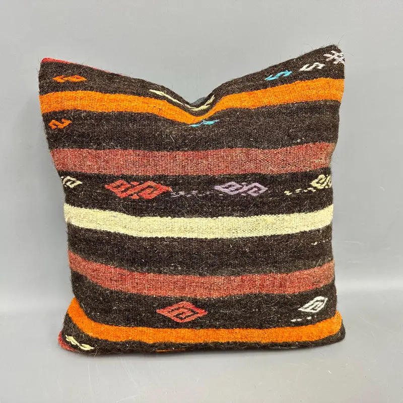 Handgewebtes marokkanisches Kelim-Wurfkissen, gestreiftes orangefarbenes und braunes Leinenkissen