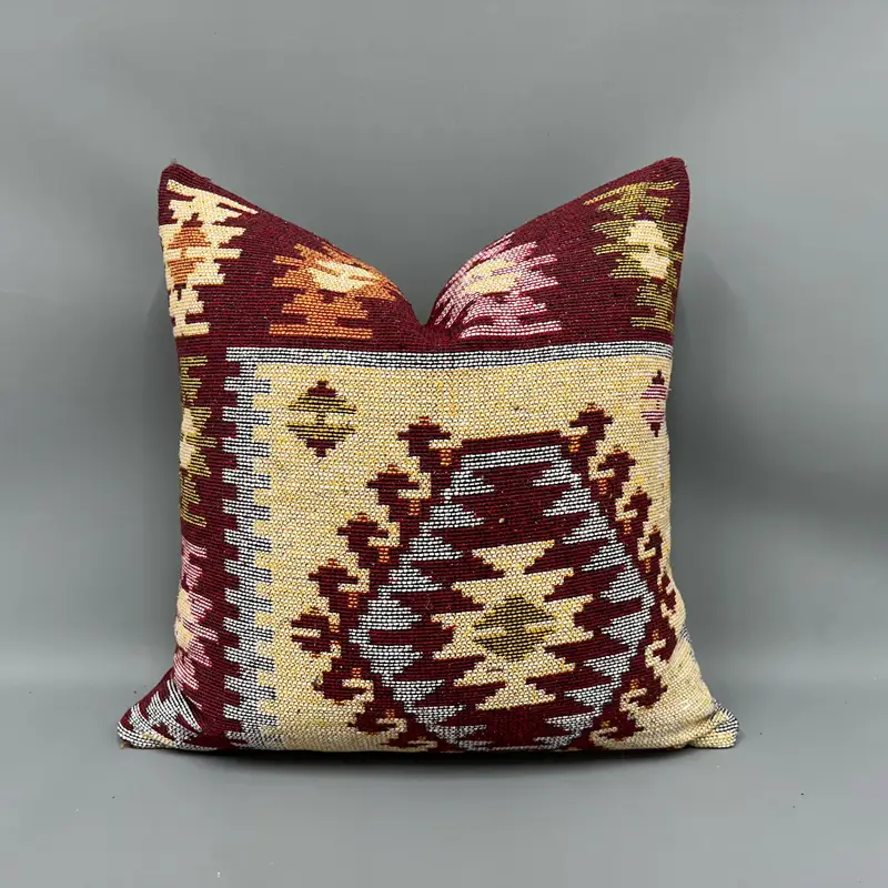 Rot & Beige besticktes Kelimkissen, handgemachtes Wurfkissen