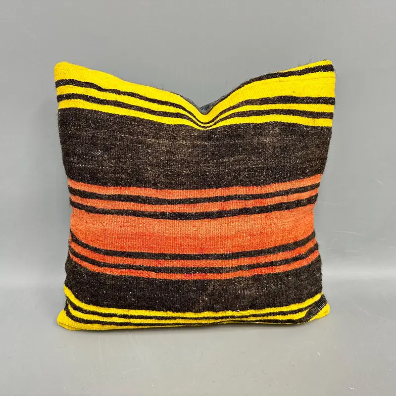 Braun & Orange gestreiftes Kissen, Vintage besticktes Kissen