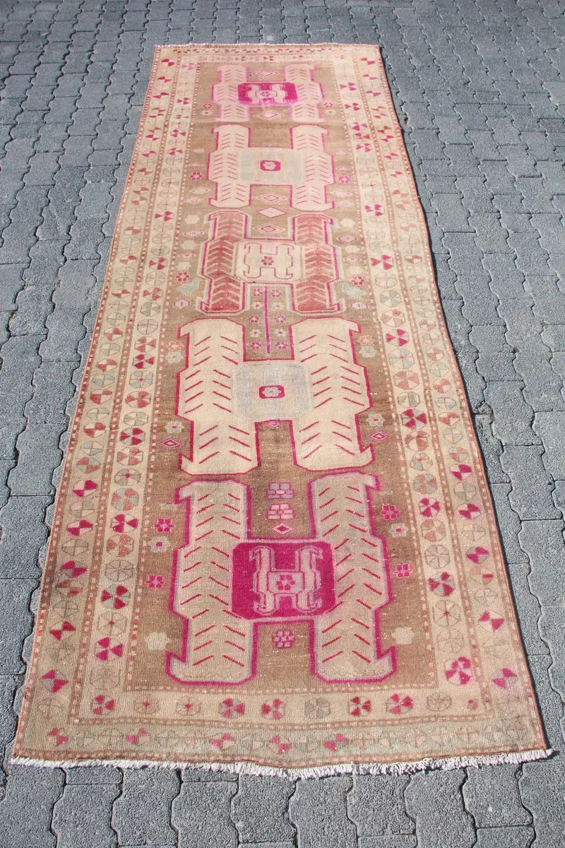 Rosafarbener geometrischer Teppich, 3,4 x 9,6 Fuß mit Blumenmotiven