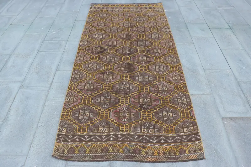 Brauner Blumenteppich, 3,5 x 8,2 Fuß, gelber Paisley-Akzent