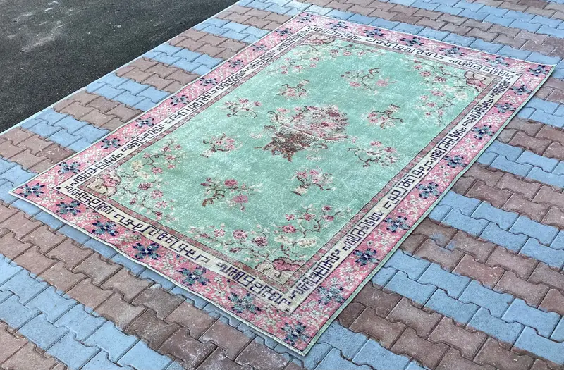 Eleganter grüner Teppich, 6,6 x 9,5 Fuß, florales und geometrisches Design