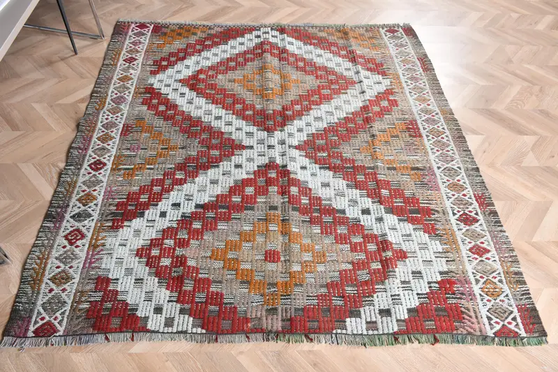 Eleganter beige-roter Blumenteppich, 5,6 x 5,9 Fuß, schickes Dekor