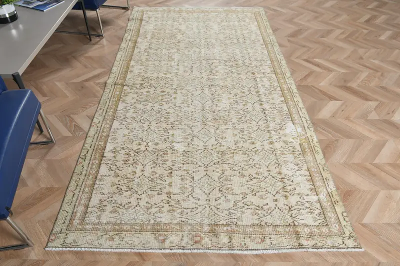 Eleganter beiger Teppich, 4,6 x 9 Fuß großes grünes Karodesign