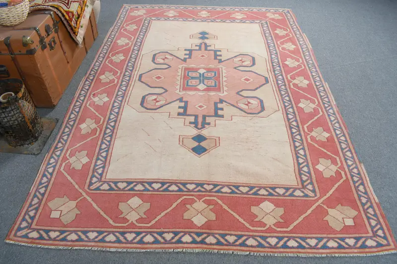 Eleganter beige-roter Teppich, 5,7 x 8,2 Fuß, floral und geometrisch
