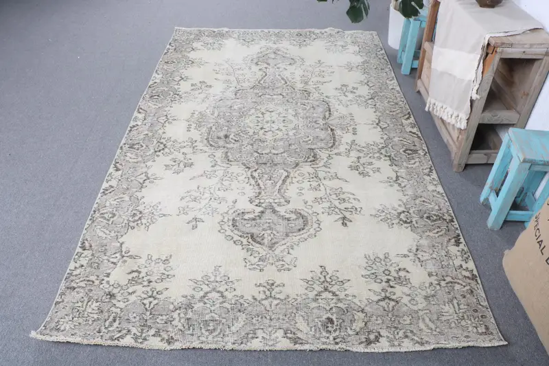 Eleganter beigefarbener Teppich, geometrische und florale Motive, 4,9 x 8,1 Fuß