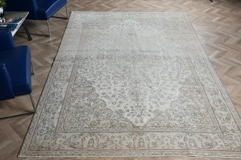 6,5 x 9,9 Fuß großer beigefarbener Teppich mit rosa Farbtönen, einfarbiges Muster