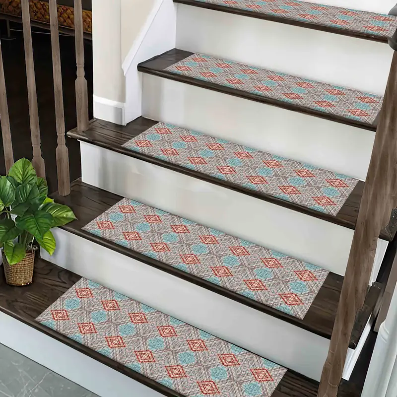 Ethnisch gemusterter Stufenteppich, bedrucktes böhmisches Kelim-Design, Azteken-Stil