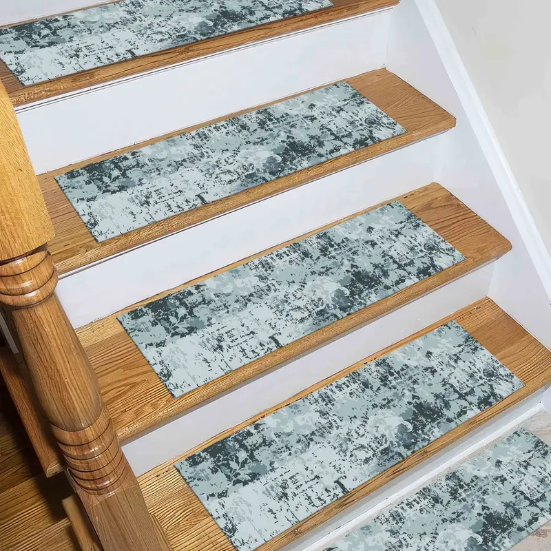 Blauer ethnischer bedruckter Teppich: Abstrakter und geometrischer Stufenteppich