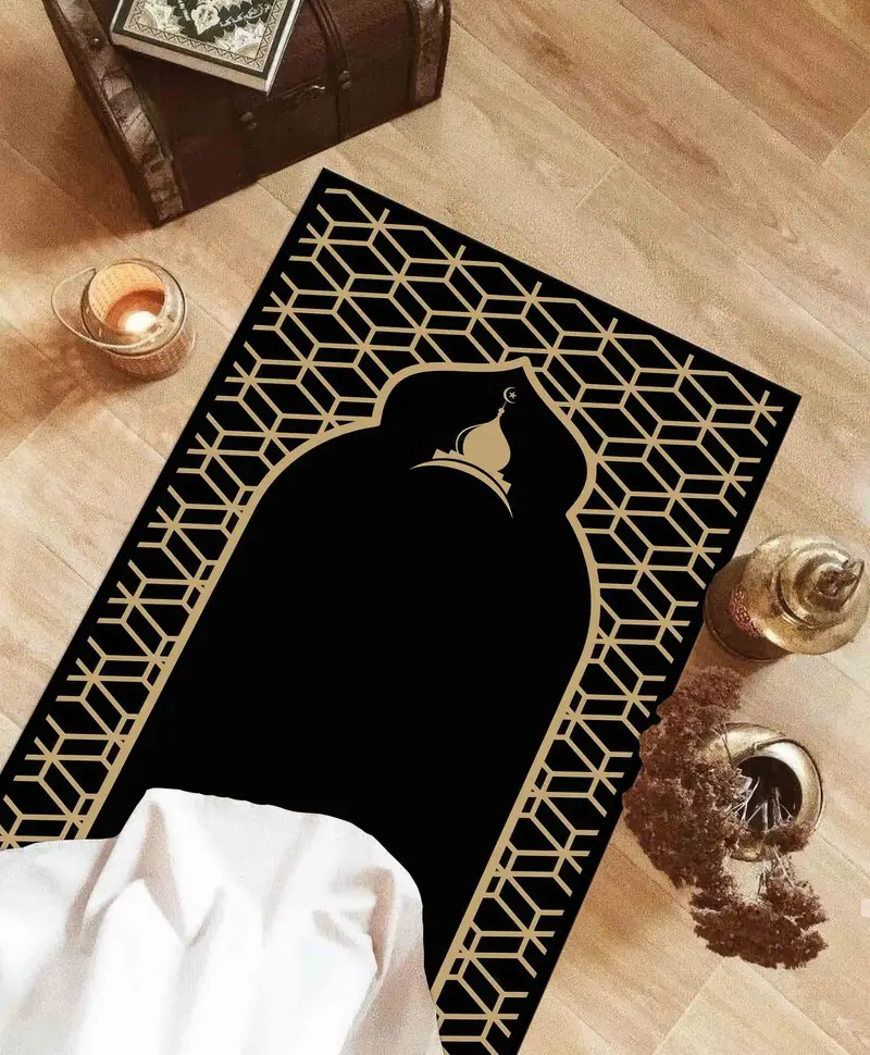 Flach bedruckter Teppich in Beige und Schwarz: Elegantes Gebetsdesign