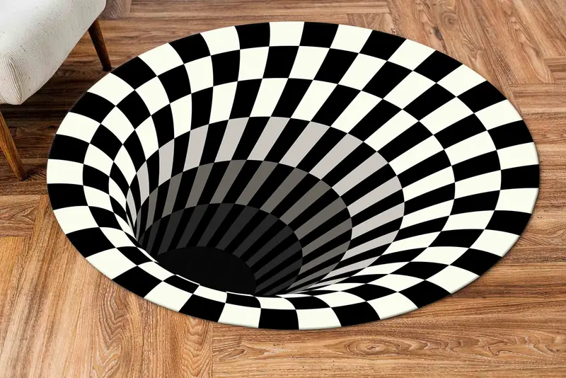 Schwarz-weißer runder bedruckter Teppich mit optischer Täuschung – modernes Dekor