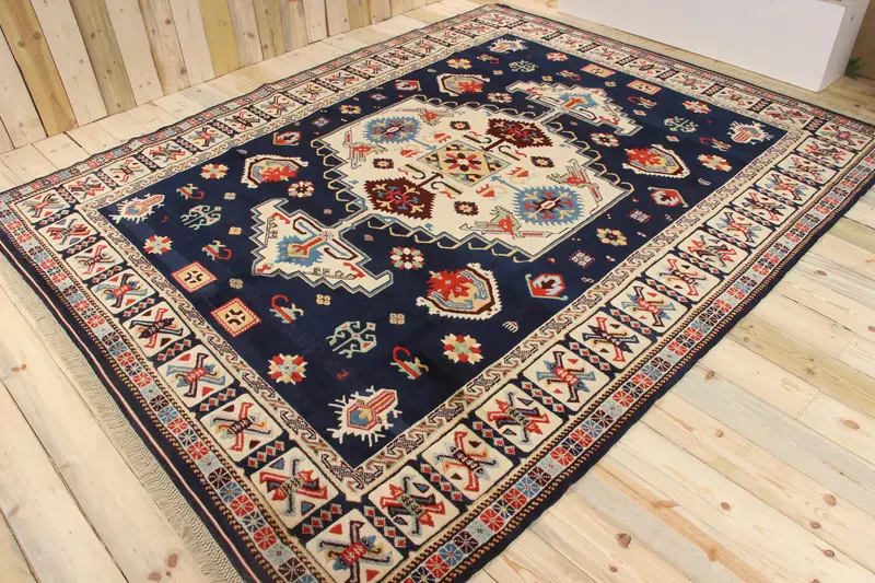 7,8 x 9,9 ft großer Vintage-Teppich, türkischer Übergröße-Teppich, blau-rot gepunkteter Teppich