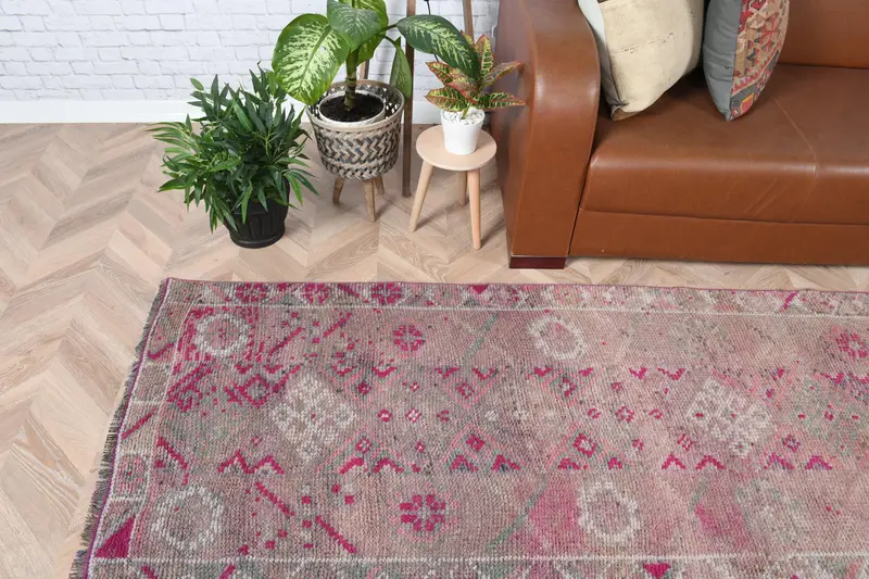 Türkischer Vintage-Teppich, 2,7 x 11,7 Fuß Teppich, rosa-grauer orientalischer Wollteppich