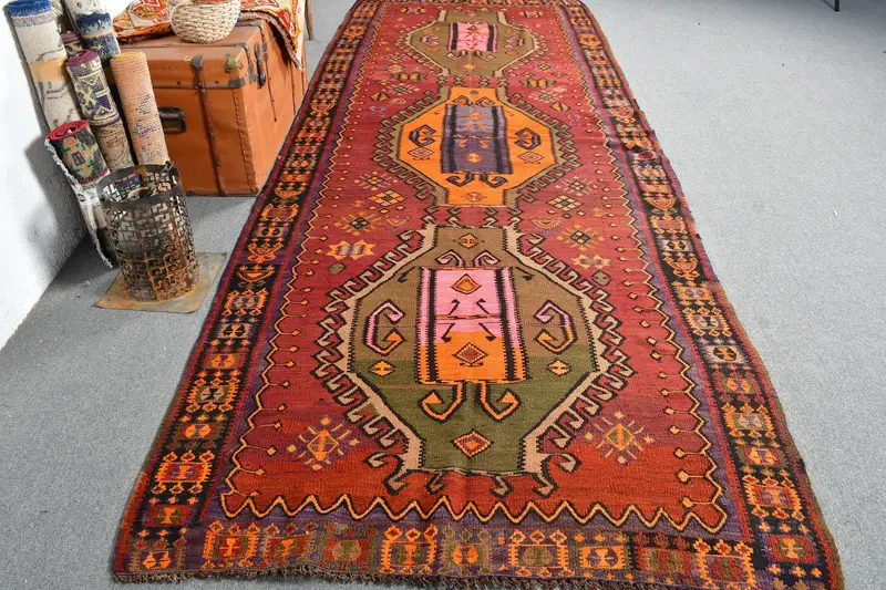 Türkischer Vintage-Teppich 4,7 x 12,9 Fuß, roter Südwest-Wollteppich