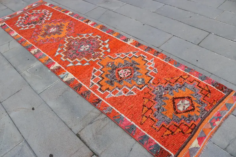 Türkischer Vintage-Teppich, 2,8 x 10,7 Fuß großer Teppich, rotgrauer massiver Teppich