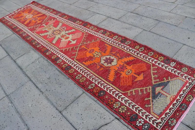 Vintage türkischer Teppich 2,8x12 ft (84x367 cm), roter Wollteppich
