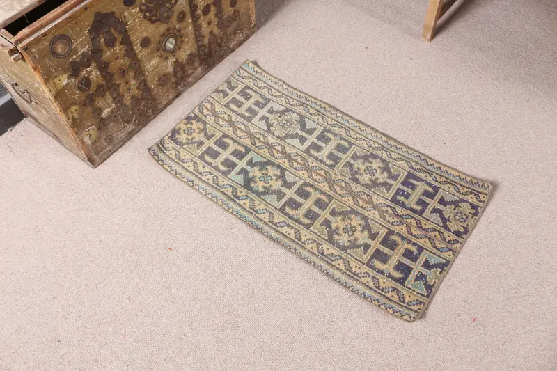 1,6x3,1 ft türkischer kleiner Teppich, blau gelber Vintage abstrakter Wollteppich