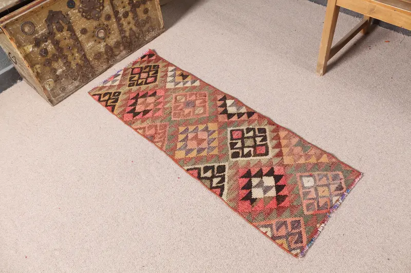 Türkischer Vintage Teppich, 1,4x4,2 ft kleiner Teppich, roter Ikat Teppich