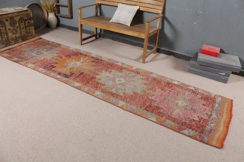 Vintage türkischer Läuferteppich 2,9x11,1 Fuß, roter massiver Teppich aus Wolle