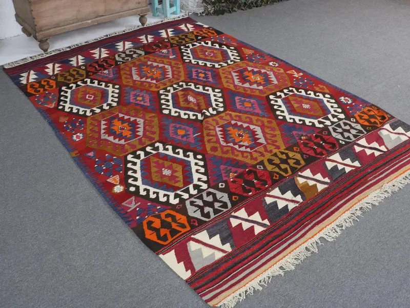 Vintage 5,5x8,5 ft Teppich, großer türkischer Teppich, roter Patchwork-Wollteppich