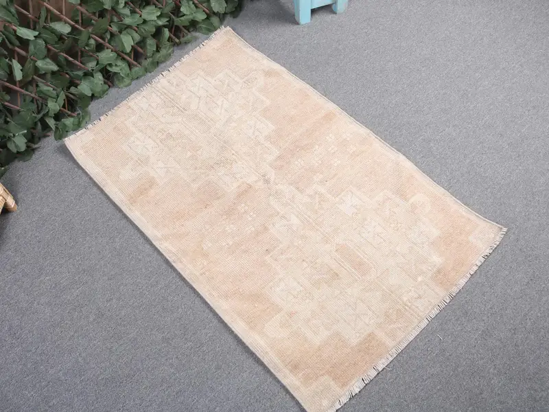 2,2x3,6 ft türkischer Teppich, kleiner Vintage-Teppich, beige-weißer Polka-Dot-Teppich