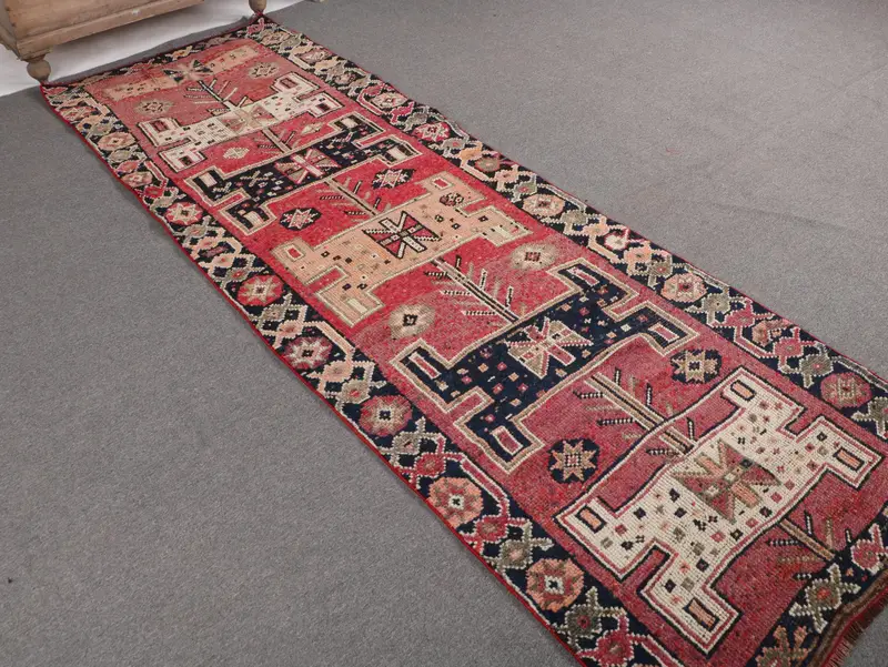 3,2x9,8 ft Teppich, türkischer Vintage Teppich, rot karierter Wollteppich