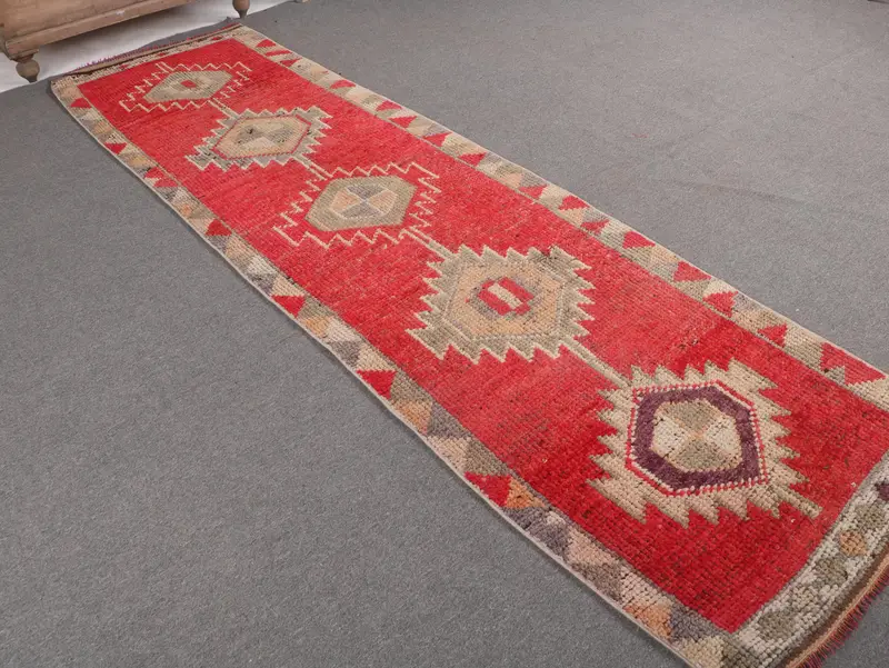 Vintage 2,8x10,3 ft Teppich, türkischer Läuferteppich, rotgrauer Randteppich