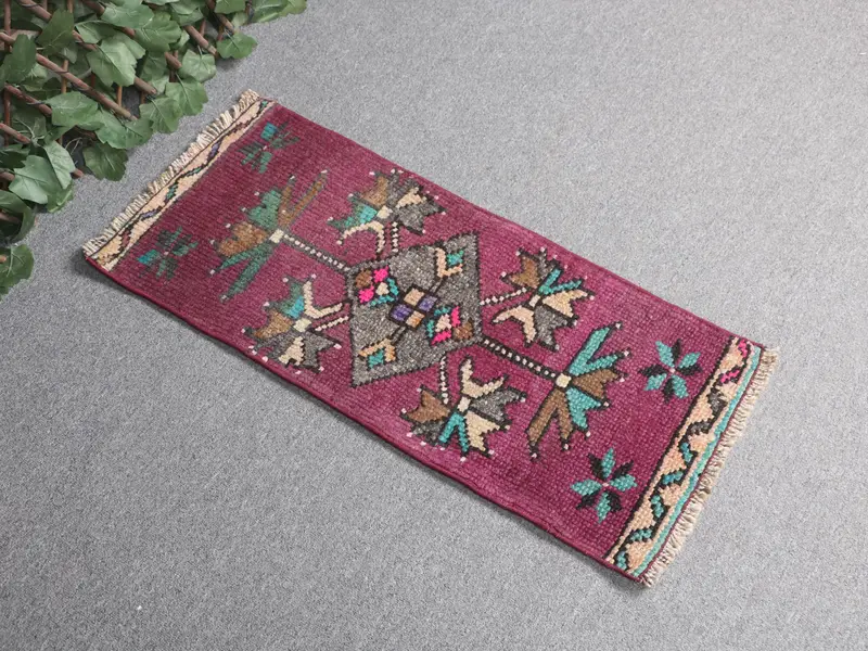 Türkischer Vintage-Teppich, kleiner 36 x 80 cm großer Teppich, roter Wollteppich mit Blumenmuster