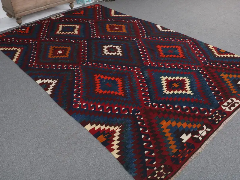 6,2x9,8 ft türkischer Kelimteppich, Vintage Teppich, rot gestreifter Wollteppich