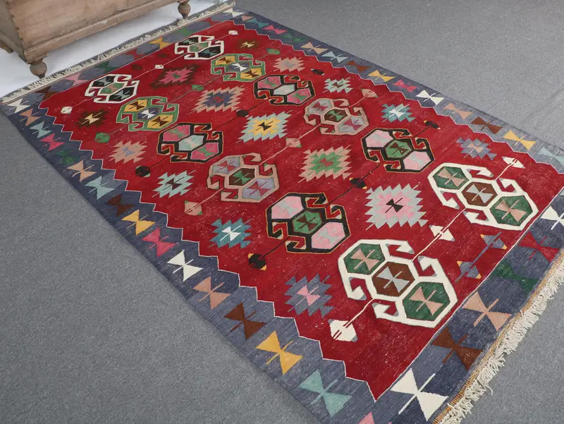 Türkischer Vintage-Teppich, 5,1 x 7,6 Fuß Kelim-Teppich, rot-blauer Südwestteppich