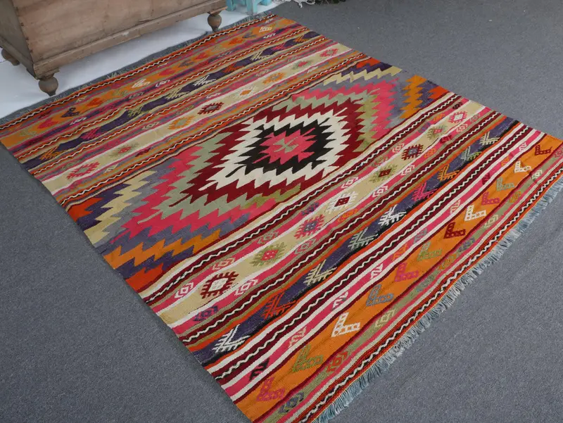 Türkischer Vintage-Teppich 5,3 x 5,9 Fuß, roter Kelim-Streifenteppich