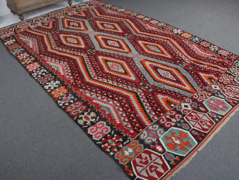Türkischer Vintage-Teppich, 6,4 x 10,7 Fuß großer Kelim-Teppich, rot-orange gestreifter Wollteppich