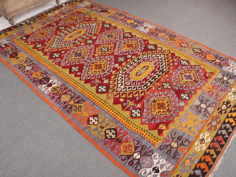 6,6x11,1 ft Kelim Teppich, türkischer Vintage Teppich, rot gelber Ikat Teppich