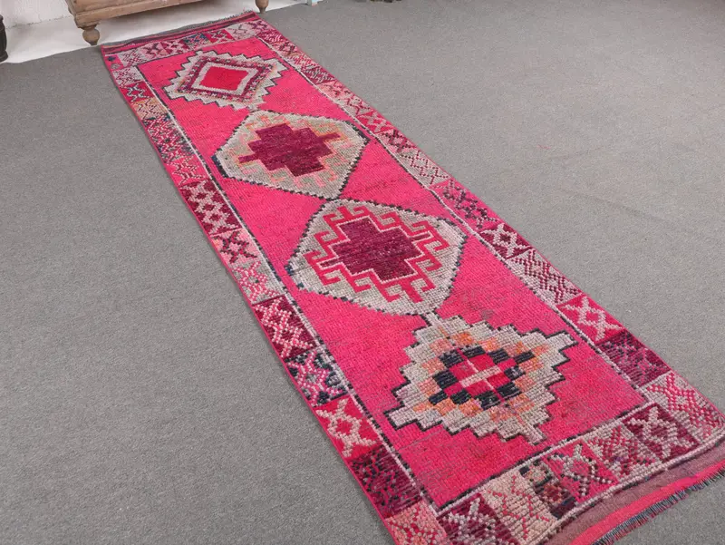 2,9x10,2 ft türkischer Teppich, Vintage Läuferteppich, rot gestreifter Wollteppich