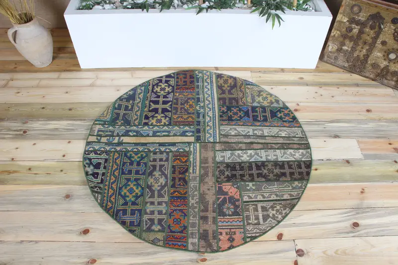 Türkischer Vintage-Teppich 3,9 x 3,9 Fuß, grüner geometrischer Patchwork-Teppich