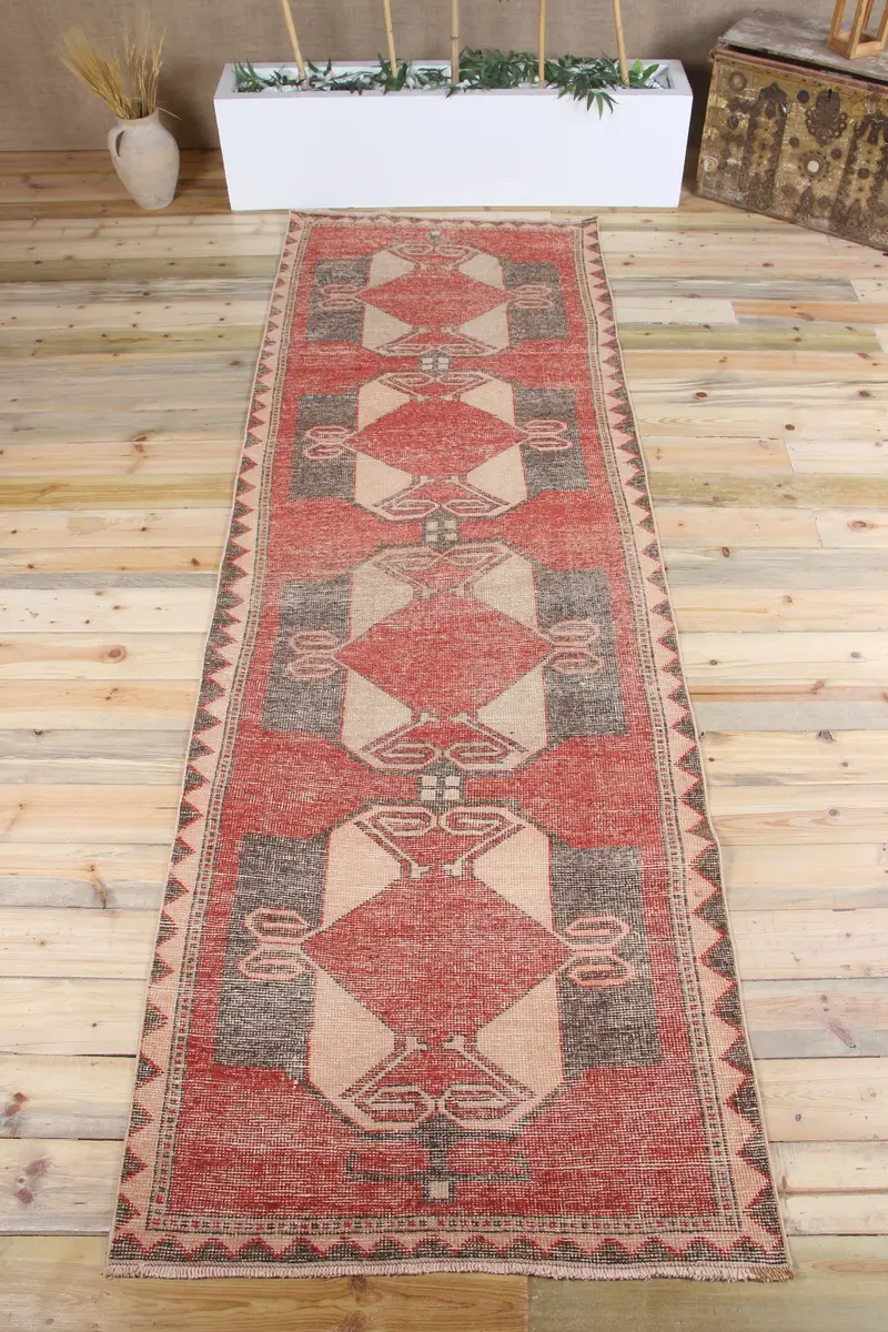 Vintage 3,5x10,8 ft Teppich, türkischer Läuferteppich, rotgrauer geometrischer Wollteppich