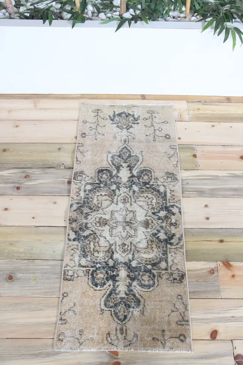 Vintage Teppich, kleiner 1,5x3,7 ft türkischer Teppich, brauner schwarzer Wollteppich mit Blumenmuster