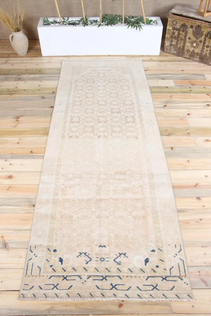 Türkischer 3,6x9,7 ft Läufer Teppich, Vintage Teppich, Teppich beige geometrischer Teppich