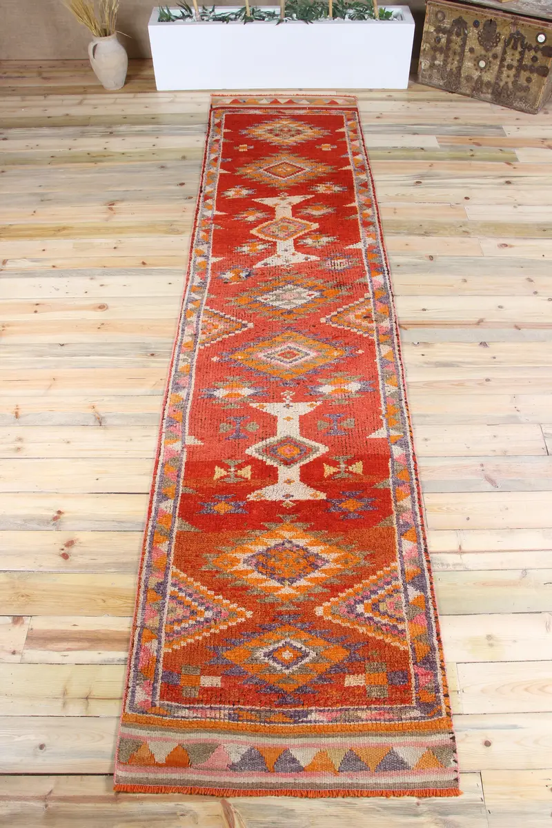 Vintage Läuferteppich, 2,9x12,6 ft türkischer Teppich, roter Herki-Wollteppich