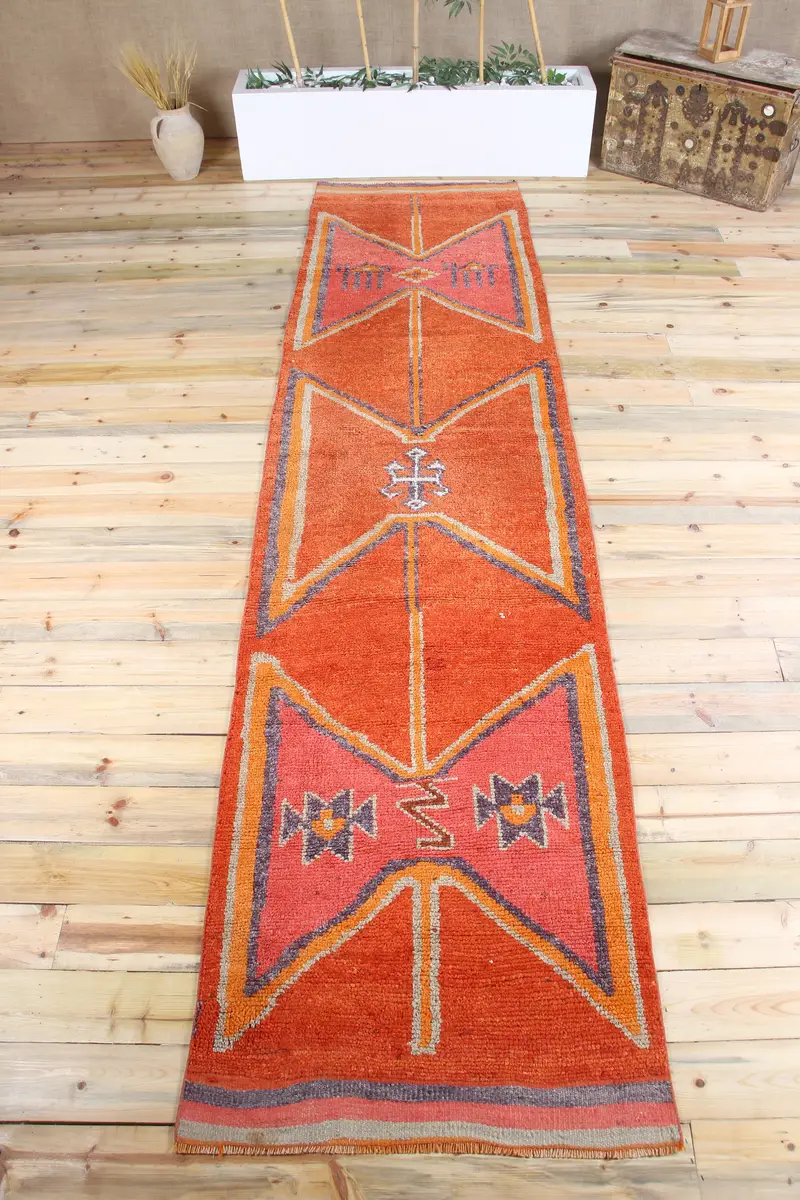 3x12,6 ft türkischer Herki Teppich, Vintage Teppich, oranger geometrischer Wollteppich