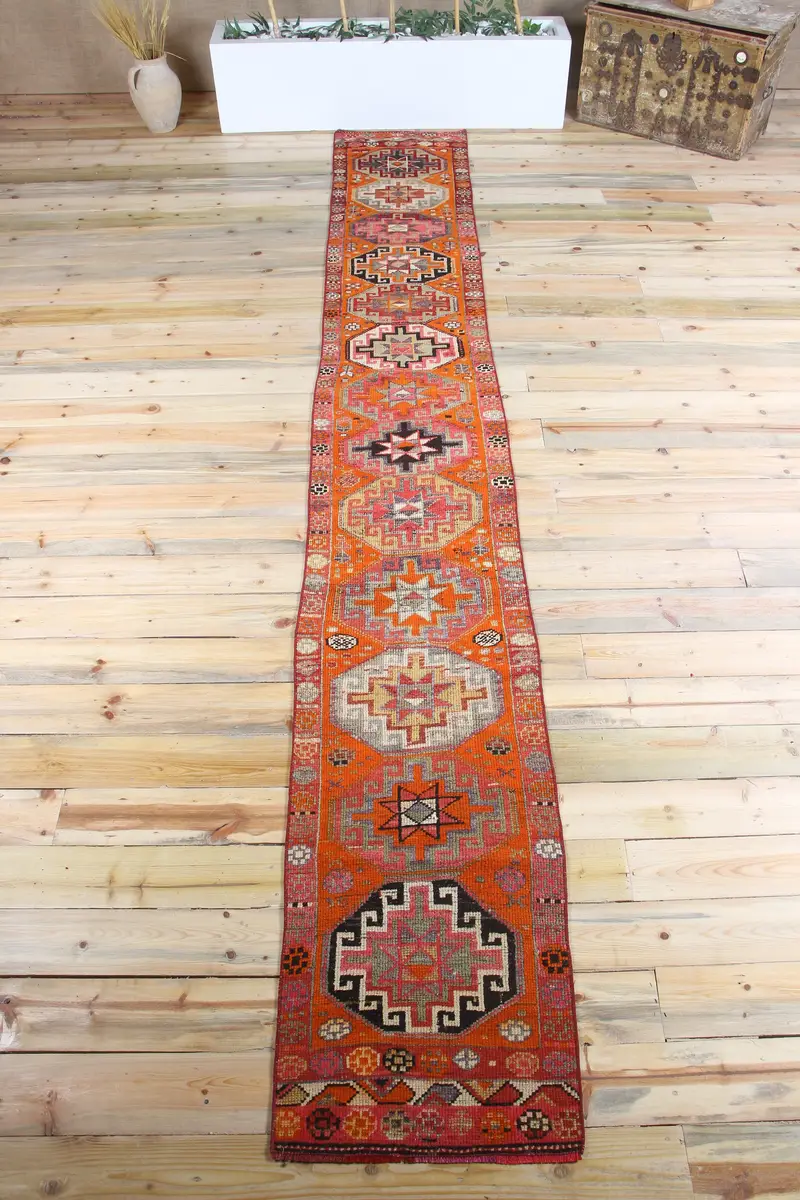 Vintage Herki Teppich 1,8x13,8 ft, orange-rosa geometrischer türkischer Wollteppich