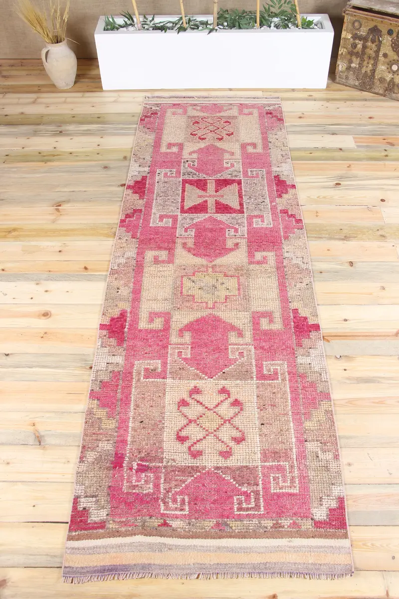 3,1x10,1 ft türkischer Teppich, Vintage Läuferteppich, rosa beige geometrischer Wollteppich