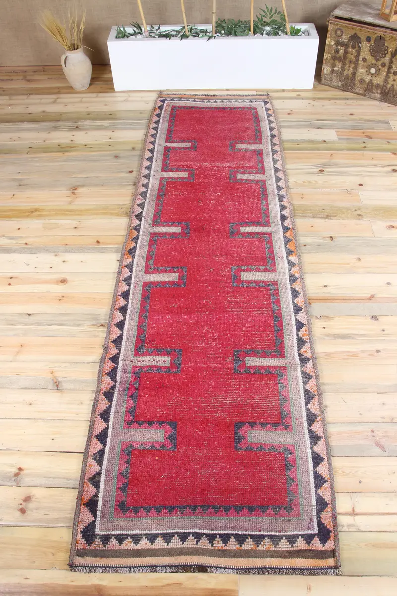 Türkischer Vintage Herki Läuferteppich 3,2x11 Fuß, rosa geometrischer Teppich aus Wolle