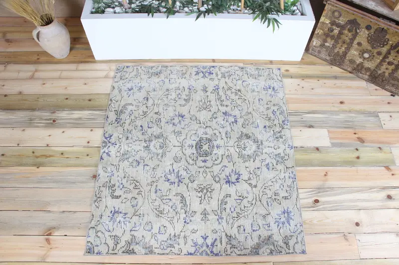 Türkischer Akzentteppich 4 x 4,5 Fuß, Vintage-Teppich, blauer Blumen-Wollteppich