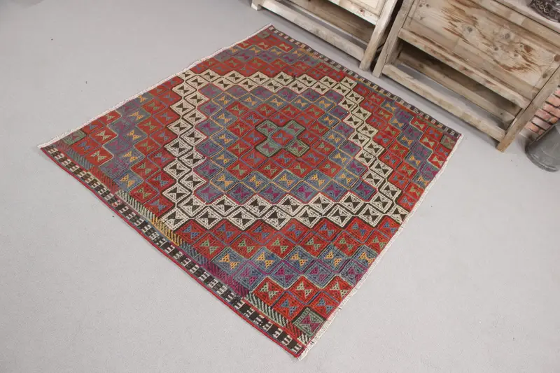 4,8x3,9 ft Teppich, türkischer Akzentteppich, roter Kelim-Streifenteppich