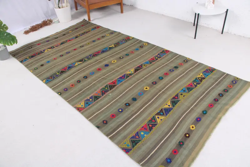 Kelimteppich, 4,5 x 8,9 Fuß türkischer Teppich, grüner Blumenteppich aus Wolle