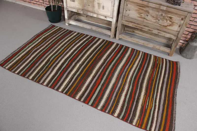 3,37 x 6,3 ft türkischer Teppich, Vintage-Akzentteppich, braun-roter Pflanzen- und Bäume-Wollteppich