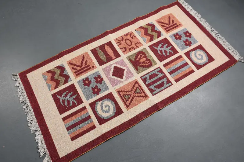 Kleiner türkischer Vintage-Teppich 2,5 x 5,1 Fuß, rot-beige karierter Wollteppich