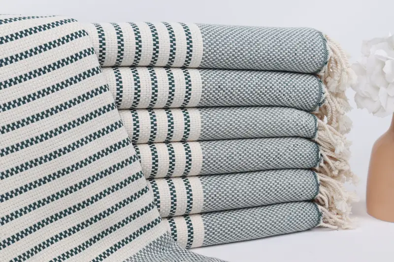 Die Handtücher bestehen aus 100 % türkischer Bio-Baumwolle und gewährleisten eine hohe Saugfähigkeit und schnelle Trocknungseigenschaften, wodurch sie sich ideal für verschiedene Verwendungszwecke eignen. Diese Handtücher haben eine Größe von 100 x 190 cm (40 x 75 Zoll), wiegen 400 Gramm und erlauben eine Toleranz von 5 % bei Größenabweichungen. Webtoleranzen sorgen für eine einheitliche Produktion.