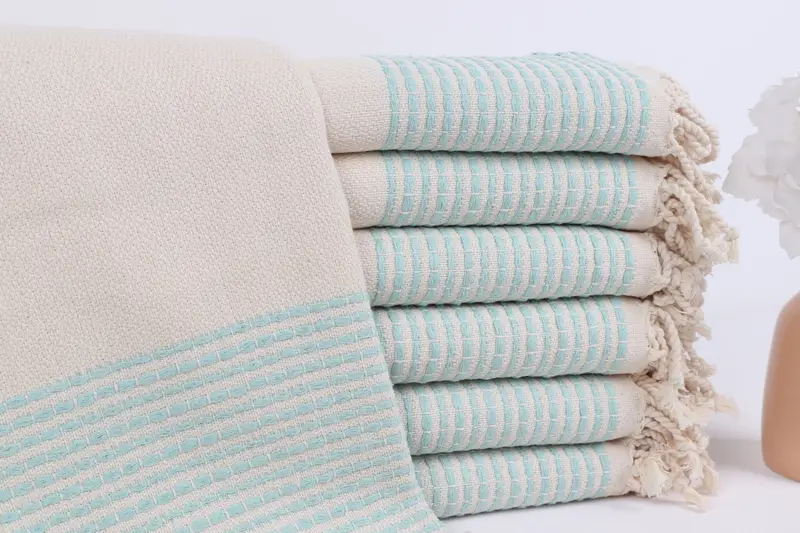Die Faserzusammensetzung zeichnet die Handtücher aus 100 % türkischer Bio-Baumwolle aus und gewährleistet eine hohe Saugfähigkeit und schnell trocknende Eigenschaften. Jedes Handtuch misst 36 x 69 Zoll oder 90 x 175 cm, wiegt 460 Gramm und weist eine Handwebtoleranz von ±2,5 % auf. Die Toleranzen können geringfügig variieren, was zu einer Maßanpassung von bis zu 5 % führt.